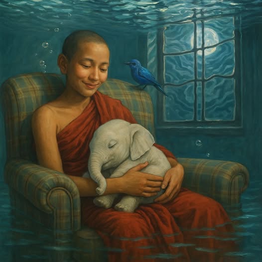 夜深,水面無波。月光穿過窗櫺,折射成一片扭曲的銀紗,覆在沉靜的房間裡。紅衣小僧靜坐於格子扶手椅中,眼簾半垂,嘴角含笑,彷彿聽見遠方法音潺潺。他懷中抱著一隻白色小象,象鼻輕繞手臂,安然入夢。椅背上,一隻藍鳥棲息不語,如守護者般靜觀其變。